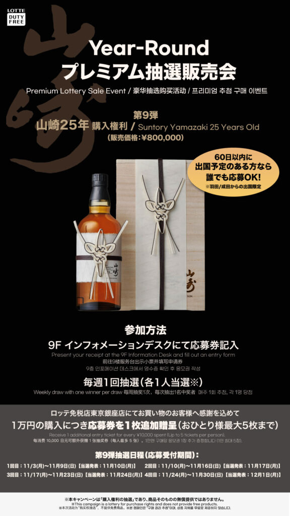 ロッテ免税店東京銀座店では、特別なプレミアムウイスキーが手に入る「Year-Round プレミアム抽選販売会」を開催中!